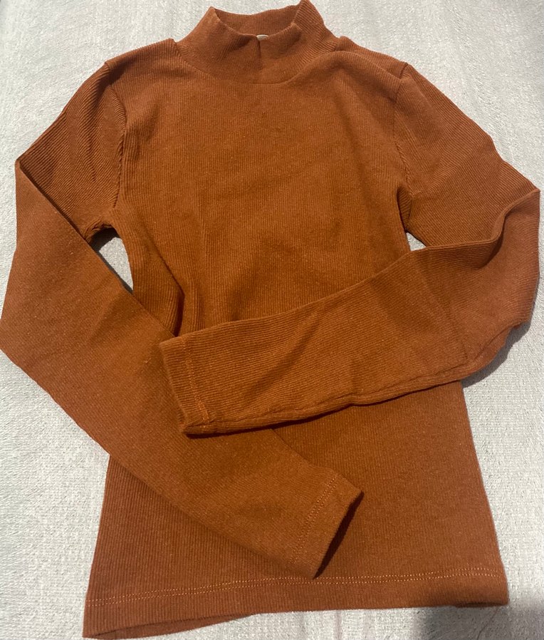 Yumuşak yünden, kahverengi, uzun kollu ve yarım balıkçı yakalı, vücuda oturan düz kazak. Günlük kullanıma uygun sade ve rahat stil sunar.