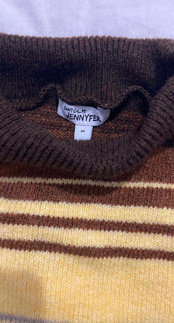 Jennyfer marka, kahverengi renkte, yün örme kumaştan yapılmış, yarım balıkçı yaka ve uzun kollu, dar kesim kız kazak.