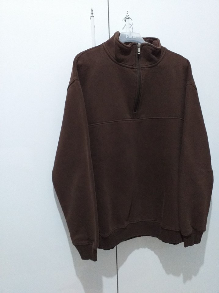 Yarım fermuarlı, yüksek yakalı kahverengi erkek polar sweatshirt. Uzun kollu ve bol kesim, günlük rahat kullanım için uygundur.