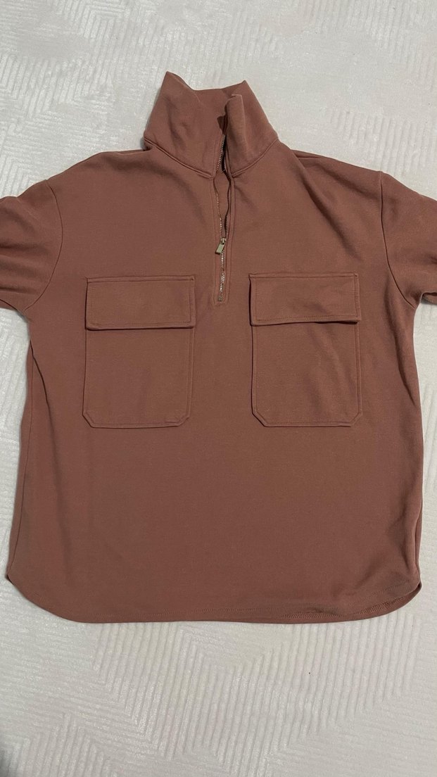 Kahverengi sweatshirt, yüksek yakalı yarım fermuarlı, kısa kollu ve bol kesimdir. Önünde iki kapaklı cep bulunur, orta boy uzunluktadır ve yumuşak, sıcak kumaştandır.