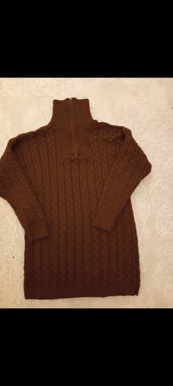 Kahverengi, yarım fermuarlı, uzun kollu, örgü kadın kazak. Yüksek yakalı ve vücuda oturan normcore tarzda, koyu renkte rahat bir parça.