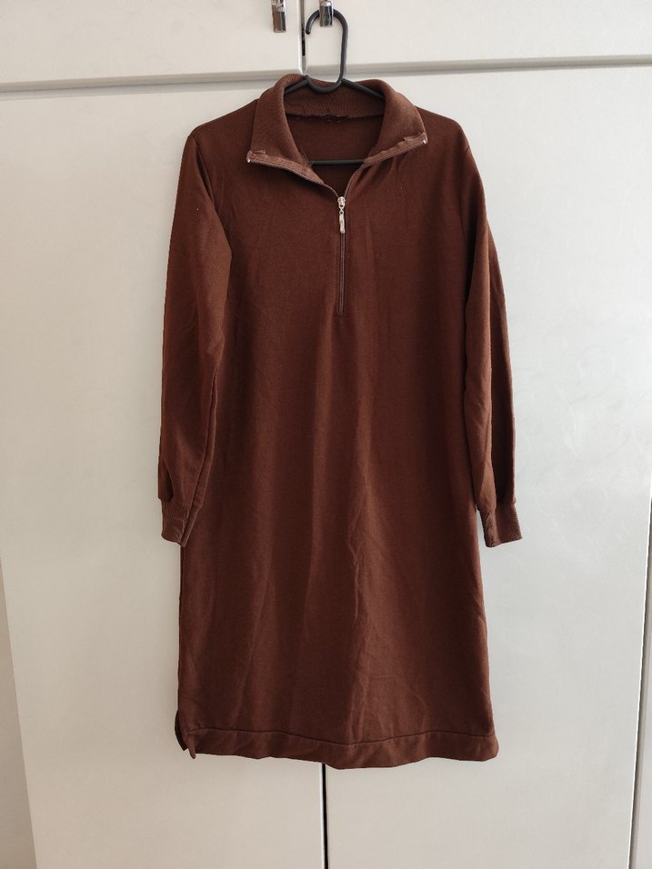 Kahverengi triko elbise, yüksek yakalı ve fermuarlı, uzun kollu, rahat kesimdir. Midi boy ve yumuşak, sıcak kumaştandır. Günlük kullanıma uygundur.