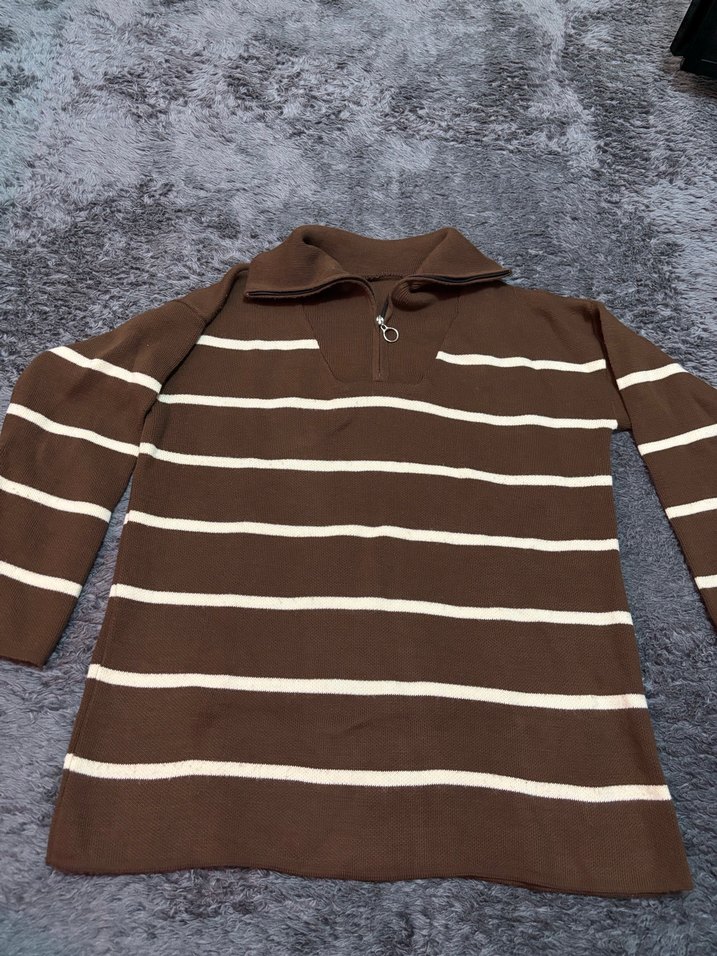 Kahverengi, uzun kollu, yarım fermuarlı triko kazak. Bol kesim ve midi boy, günlük rahat sokak stili için uygun. Standart beden .
