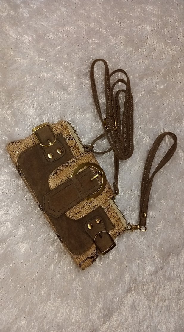 Kahverengi, koyu yılan desenli, kemerli tasarıma sahip bohem ve retro tarzda çanta. Ayarlanabilir ve çıkarılabilir askısı bulunur.