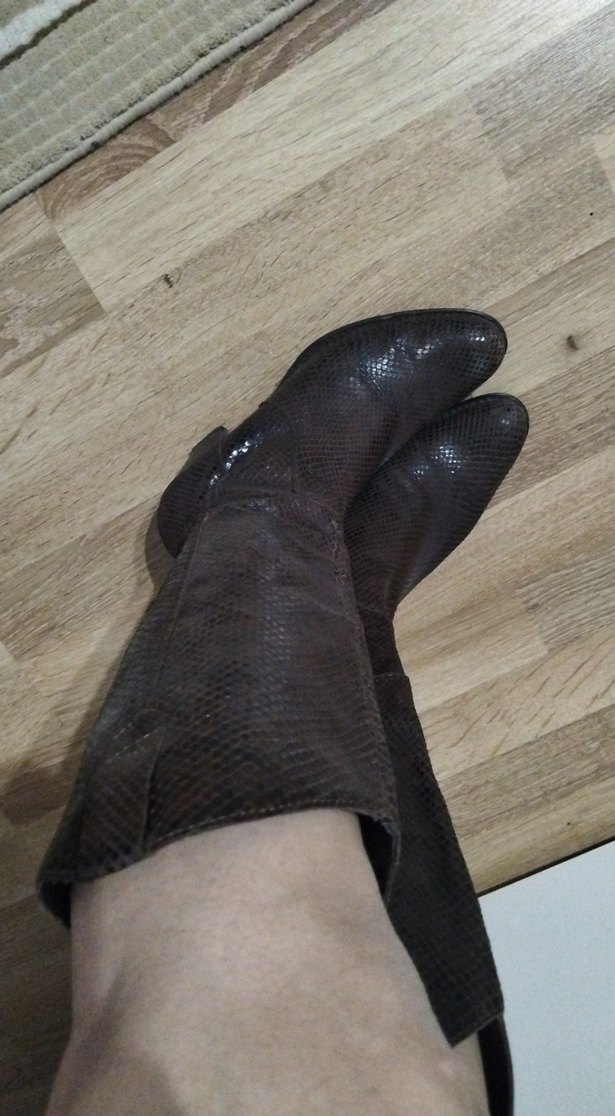 Kahverengi deri, yılan derisi desenli diz boyu çizmeler, ince topuklu ve tokalıdır. Trendy casual ve goth tarzlar için uygundur.