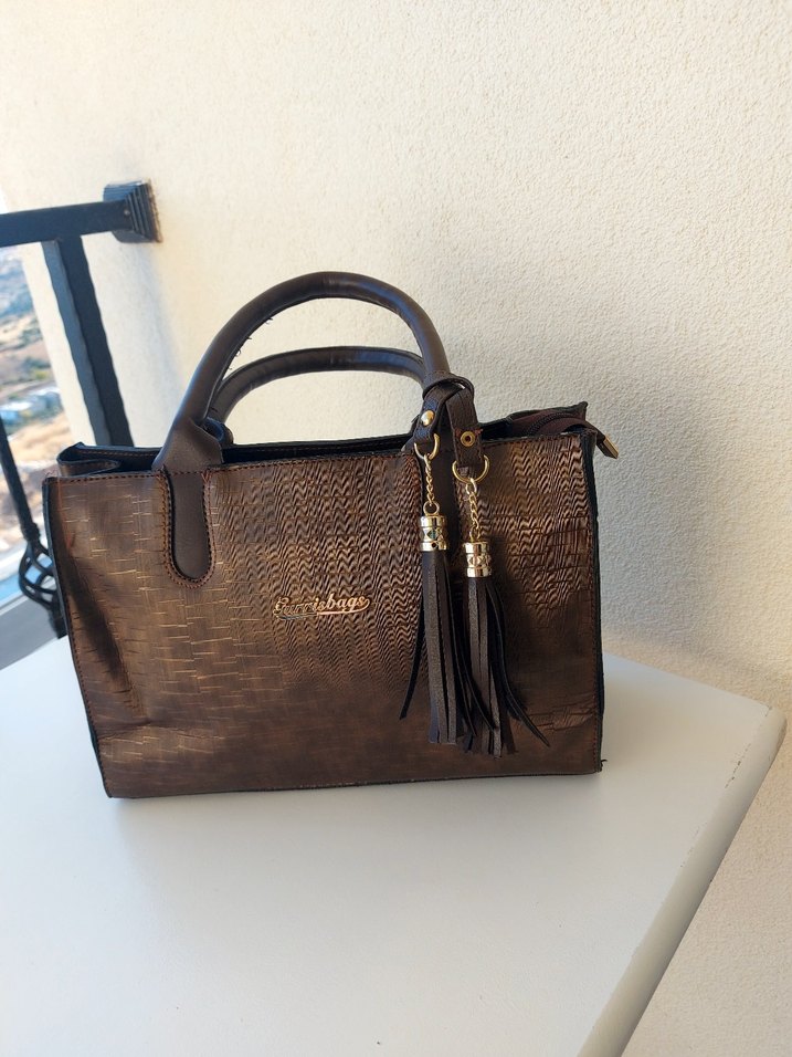Kahverengi deri, parlak yılan derisi desenli ve püsküllü detaylara sahip kadın çanta. Klasik zarafetle bohem tarzını birleştirir, günlük kullanıma uygundur.