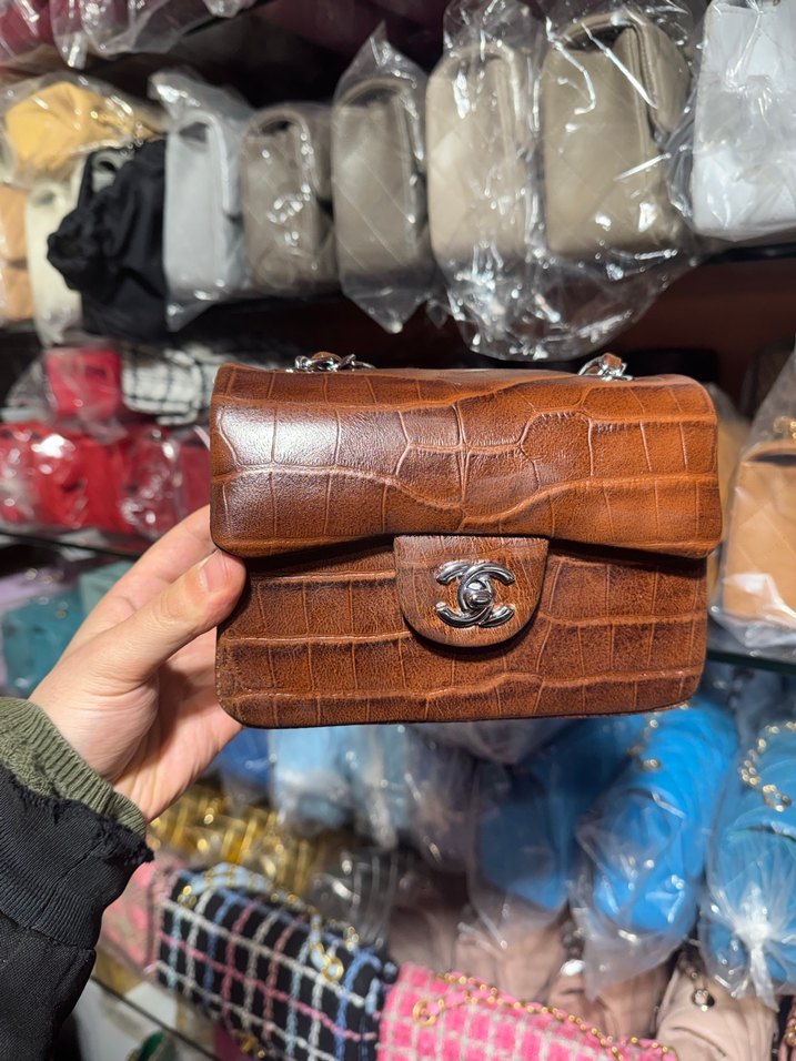 Kahverengi yılan derisi desenli, parlak görünümlü deri kadın çanta. Tokalı kapama ve Paris sokak modası tarzında, günlük kullanıma uygun.