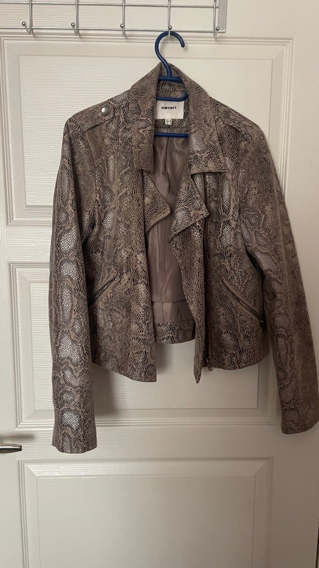 Kahverengi yılan derisi desenli deri ceket, keskin yaka ve kemerli bel detayına sahiptir. Dar kesimli, uzun kollu, günlük ve sokak tarzı için uygundur.