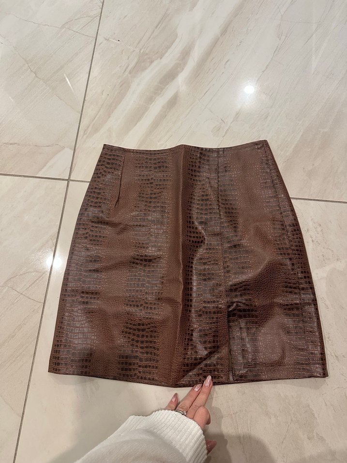 Kahverengi Yılan Derisi Desenli Deri Mini Etek
