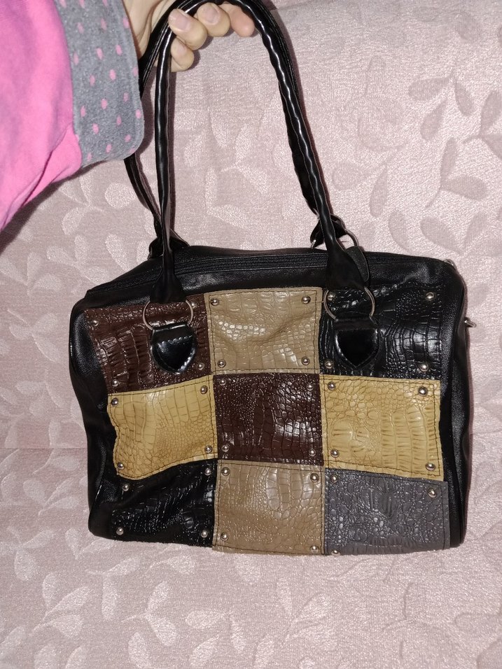 Kahverengi deri çanta, yılan derisi desenli patchwork ve tokalı detaylarla rock punk ve bohem tarzını yansıtıyor.