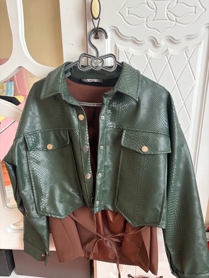 Kısa boy kahverengi deri ceket, yılan derisi desenli ve kemerli. Bol kesim, askılı kollar ve kesik yaka ile günlük sokak stili için uygundur.