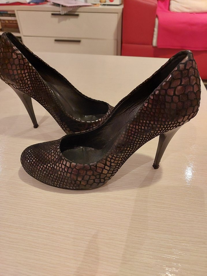 Kahverengi deri stilettolar, koyu yılan derisi deseni ve tokalı detaylarıyla cesur ve göz alıcı bir görünüm sunar. Hakiki deri