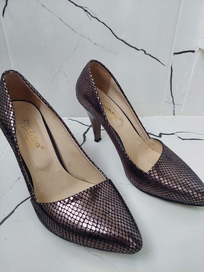 Kahverengi deri stilettolar, parlak yılan derisi deseni ve pileli detaylarla ofis için çağdaş ve zarif bir şıklık sunar.