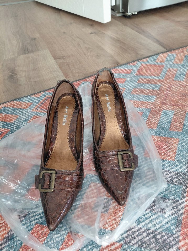 Kahverengi yılan derisi desenli deri stilettolar, tokalı kayış ve kalın topuklu tasarımıyla bohem ve Paris tarzını yansıtıyor. 36 numaradır. Resimde görüldüğü gibi ufak defosu vardır. #kadın #topukluayakkabı #stiletto