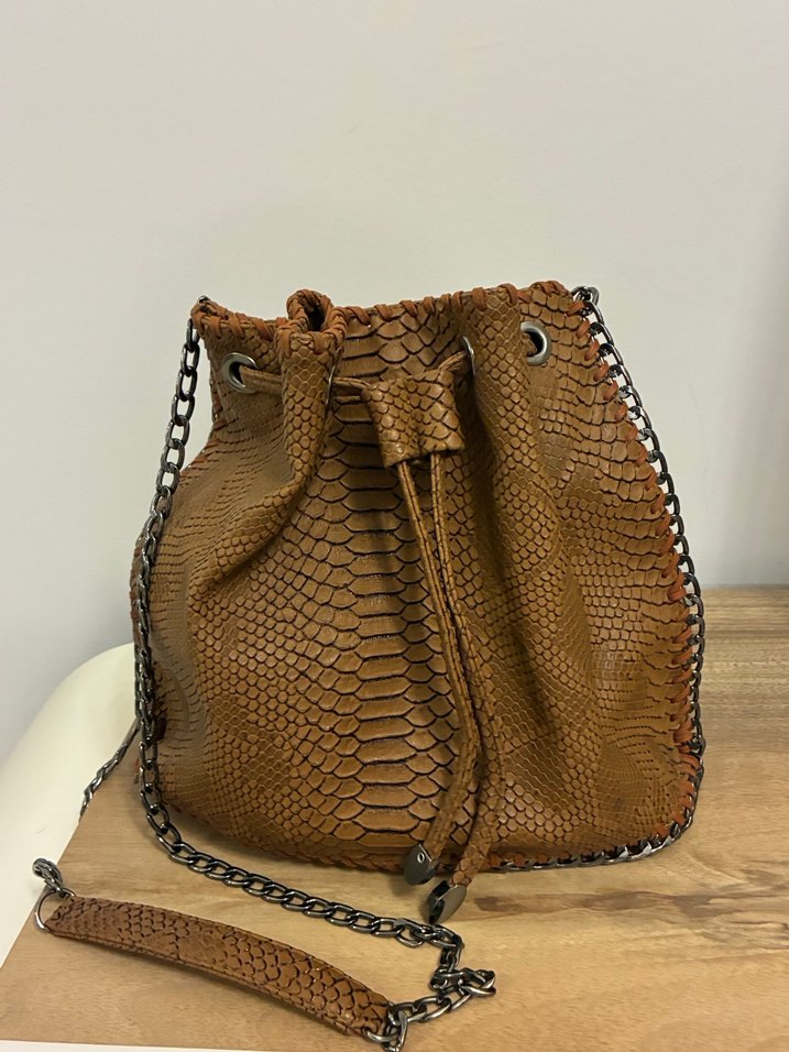 Parlak kahverengi yılan derisi desenli, zincir detaylı deri çanta. Bohem tarzda, günlük kullanıma uygun.