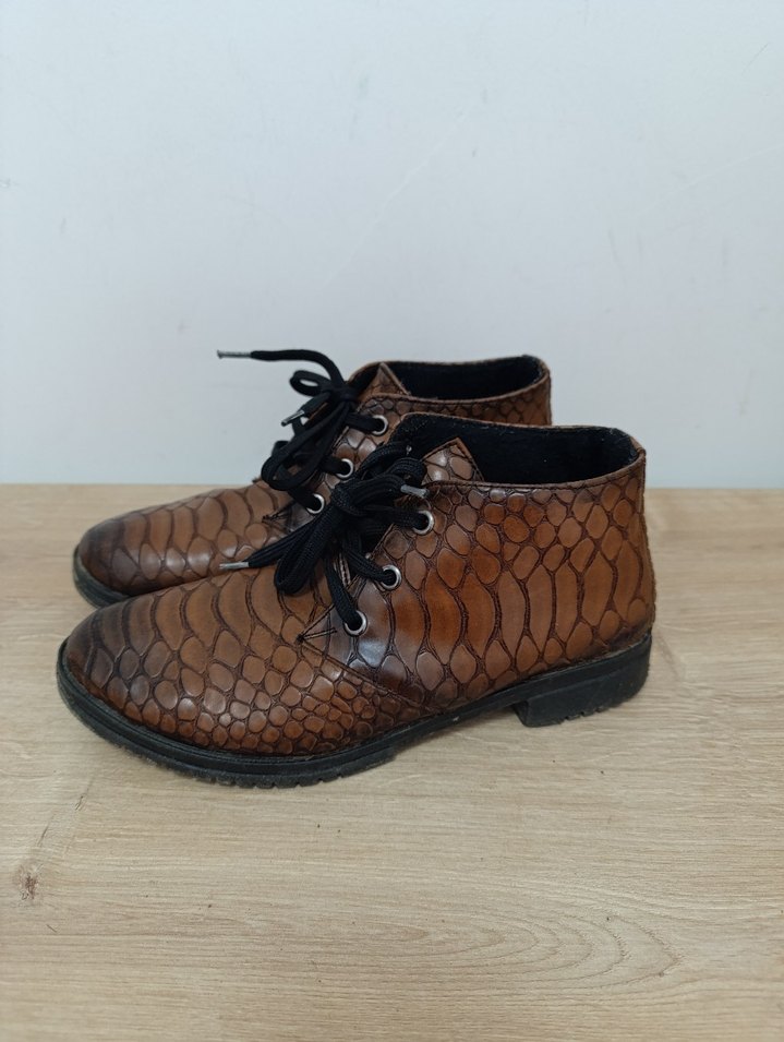 Koyu kahverengi, yılan deseniyle kaplı, bağcıklı ve tokalı bot. Paris sokak stiline uygun şık tasarım.