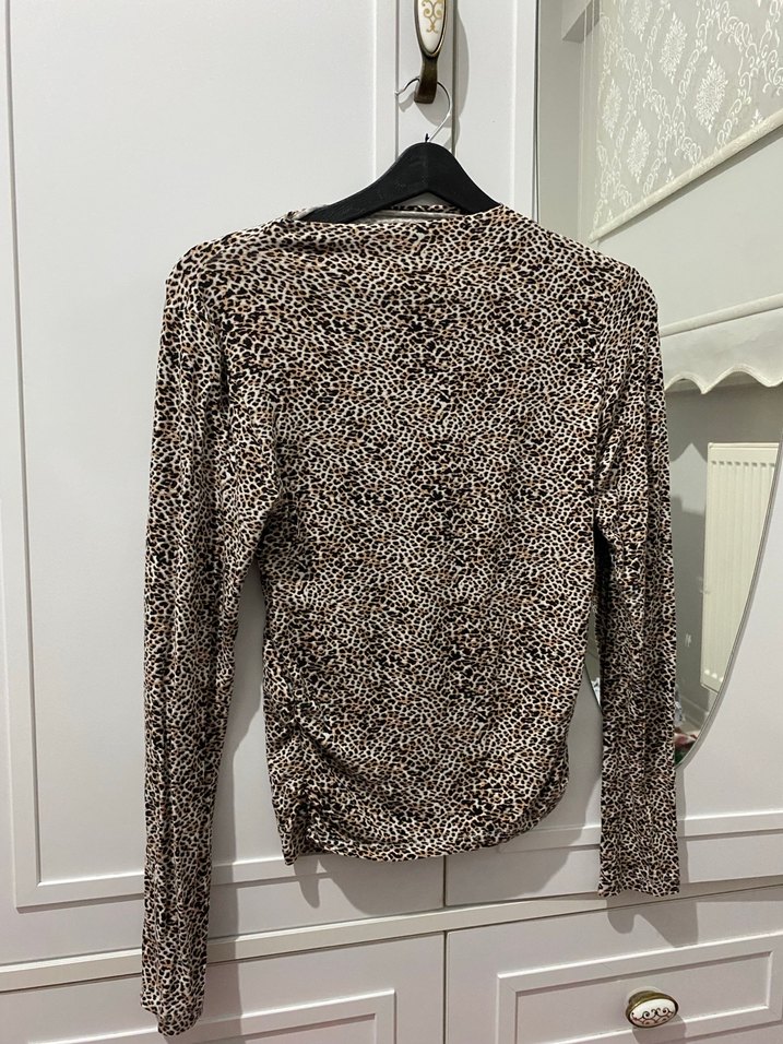 Düğmeli, balıkçı yaka, uzun kollu, kahverengi yılan desenli, midi boy, sentetik kumaştan yapılmış, dar kesim günlük sokak stili bluz.