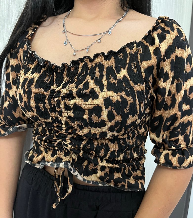 Kahverengi yılan desenli,tekne yaka ve askılı kollu, vücuda oturan sokak stili bluz. Sentetik kumaştan, günlük kullanım için midi boyda.