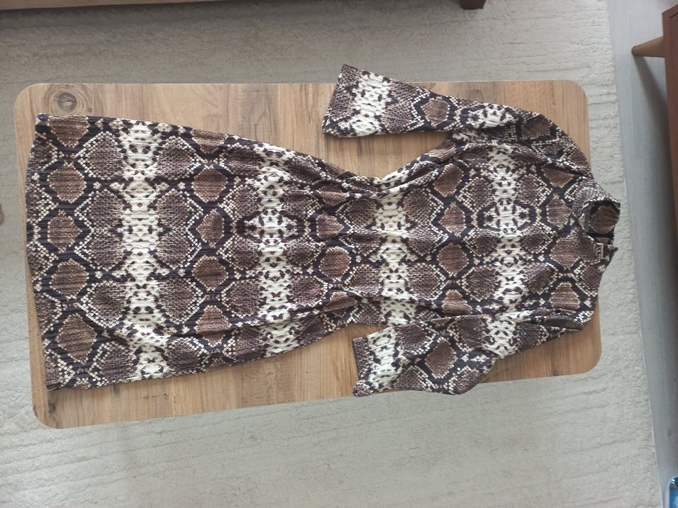 Kahverengi yılan desenli, uzun ve vücuda oturan bohem tarzda kadın triko elbise. Yumuşak sentetik kumaştan, boğazlı ve askılı kolludur.