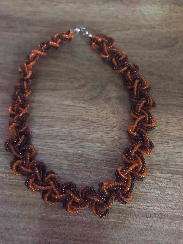 Koyu kahverengi boncuklarla yılan deseni oluşturulmuş uzun kolye, bohem tarzı yansıtır. Günlük kullanıma uygundur ve hippie, retro havası taşır.