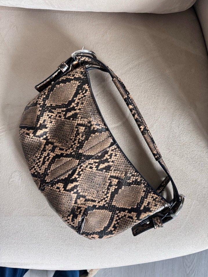 Kahverengi yılan desenli deri, tokalı askısı ile sokak modası ve Paris tarzını birleştiren kadın çantası.
