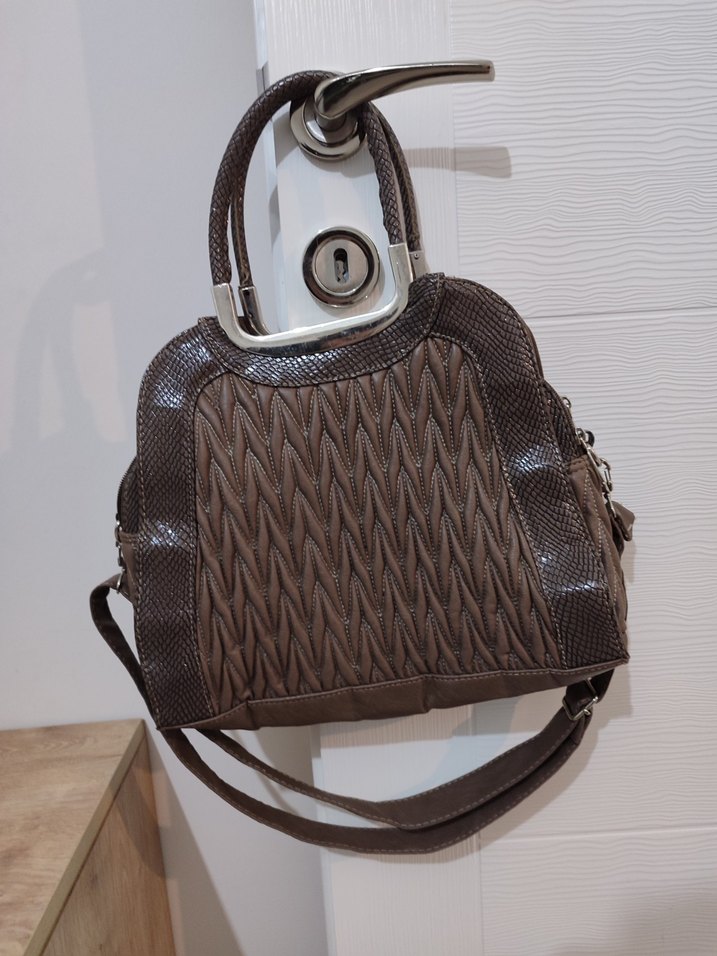 Kahverengi yılan desenli deri çanta, tokalı detaylıdır. Günlük kullanım ve sokak stiline uygundur. sadece kulp kısmında olan demirin çok az bir yeri çıktı, belli bile olmuyor, böyle de kullanılır, dilerseniz çantacı da tamir yaptırabilirsiniz. marka temsilidir