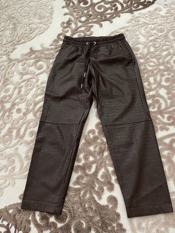 Kahverengi yılan desenli deri kadın pantolon, bol kesim ve midi boy. Kemer detaylı, günlük kullanıma uygun rahat bir model.