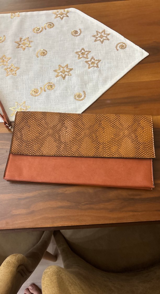 Kahverengi deri portföy çanta, parlak yılan deseni ve kemerli tasarımıyla vintage bohem tarzını yansıtıyor. Günlük kullanıma uygun.