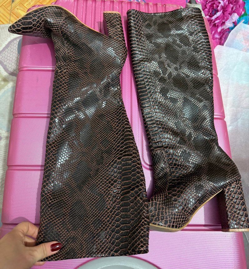 Koyu kahverengi yılan desenli, dizüstü, kalın topuk çizmeler.