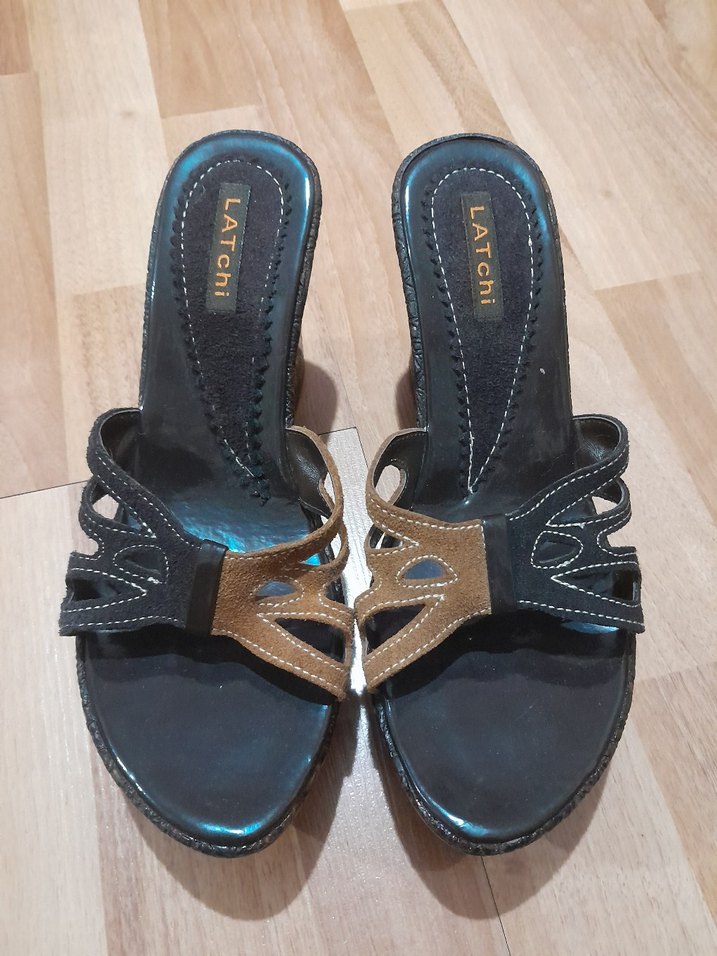 Kahverengi yılan desenli, tokalı dolgu topuklu terlik. Kauçuk malzemeden, bohem ve Paris tarzında günlük kullanıma uygun.