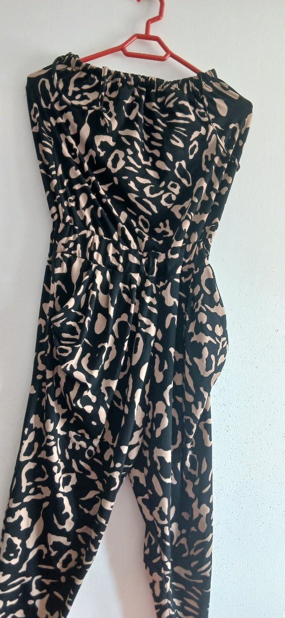 Kahverengi yılan desenli, askılı ve straplez yakalı, bol kesim hamile tulum. Sentetik kumaştan, dış mekan kullanımı için uygun.