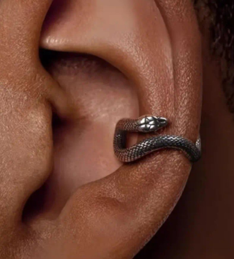 Kahverengi yılan desenli, tokalı kadın kulak manşeti. Marka Temsilidir.