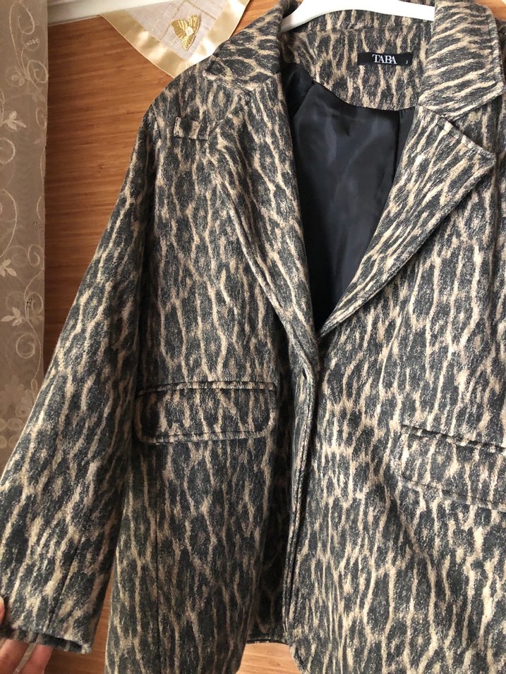 Kahverengi yılan desenli kaban, kürk detaylı ve çentikli yakalıdır. Yumuşak sentetik kumaştan yapılmış, rahat kesim ve uzun kolludur.