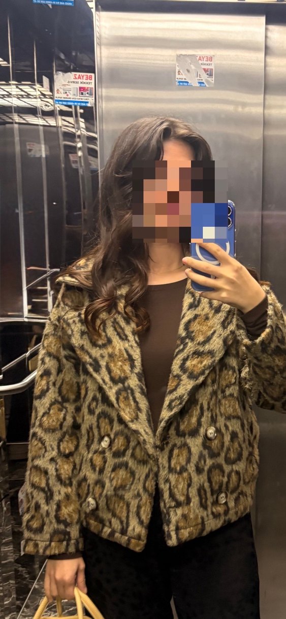 Kahverengi yılan desenli suni kürk, notched lapel yaka ve uzun kolludur. Rahat kesim, midi boy ve yumuşak, sıcak kumaştan yapılmıştır. Marka temsili
