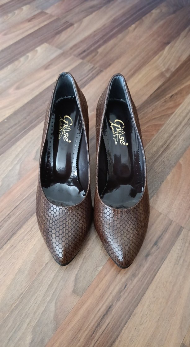 Kahverengi deri, yılan desenli kadın topuklu ayakkabılar, blok topuklu ve parlak yüzeyli, bağcıklı detaylara sahip, ofis için uygun.