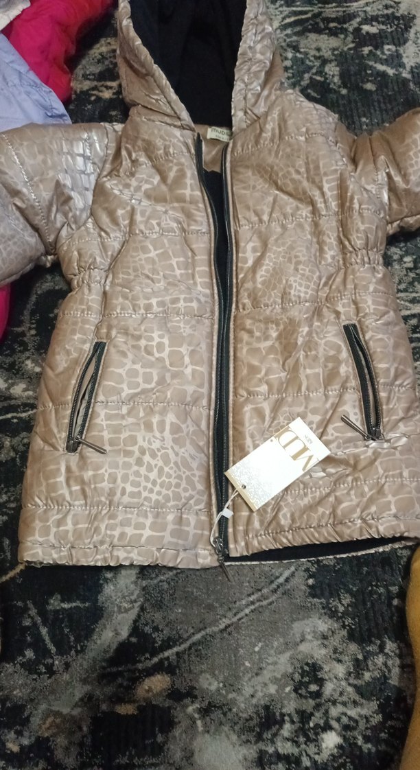 Kahverengi yılan desenli, kısa kesim, kapüşonlu ve fermuarlı kadın mont. Sokak modasına uygun, uzun kollu ve dar kesimdir.