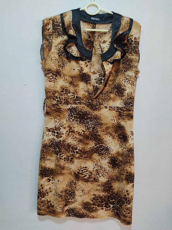 Kahverengi yılan desenli, kolsuz, v yaka ve kürk detaylı, bohem vintage tarzda, gecelik yada başka birşey için kullanabilirsiniz tercih sizin