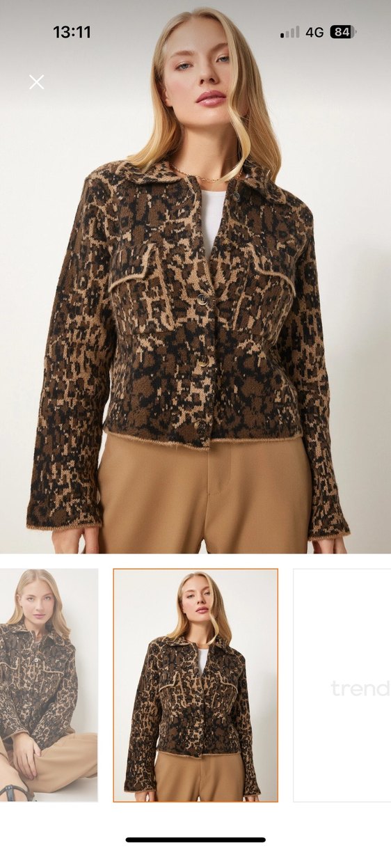 Kahverengi yılan desenli, kürk detaylı, notched lapel yakalı ve uzun kollu ceket. Normal kesim ve midi boydadır, ofis için uygundur.