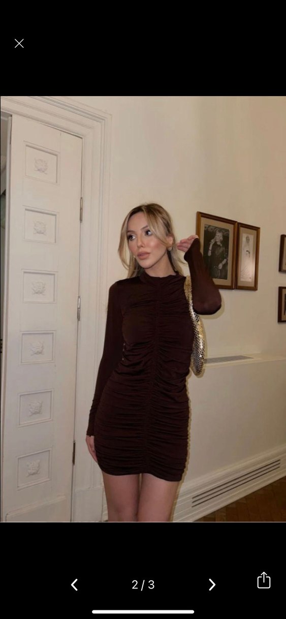 Uzun kollu, yüksek yakalı, kahverengi süet mini elbise. Yılan desenli ve pile detaylı, iddialı ve gösterişli tarz için uygun. 1 kez giyildi S beden