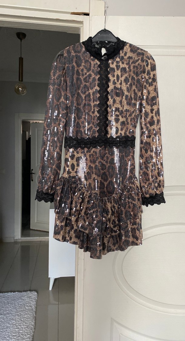 Kahverengi yılan desenli, uzun kollu, v yaka, dantelli ve fırfırlı mini elbise. Sokak stili ve parti için uygun, vücuda oturan kesim. Ürün pul patenttir