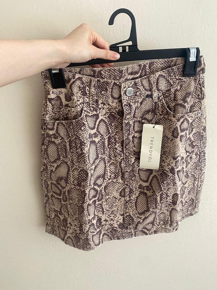 Kahverengi yılan desenli, kemerli, dar kesim mini etek, günlük sokak stili için Trendyol'dan.