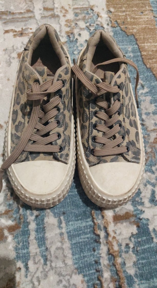Kahverengi yılan desenli, platform tabanlı kauçuk spor ayakkabı biraz tozlu giymedigim için yeni hiçbir sorunu yoktur