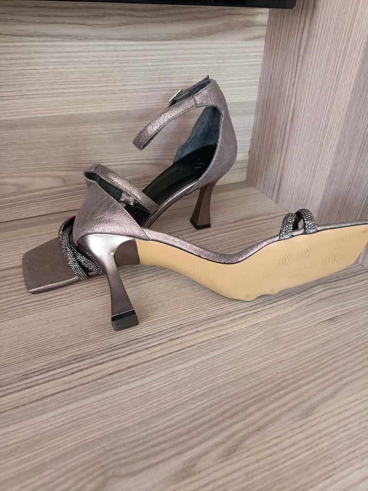 Kahverengi yılan desenli, tokalı stiletto topuklu kadın ayakkabısı. Modern tasarımıyla romantik akşamlara uygun.