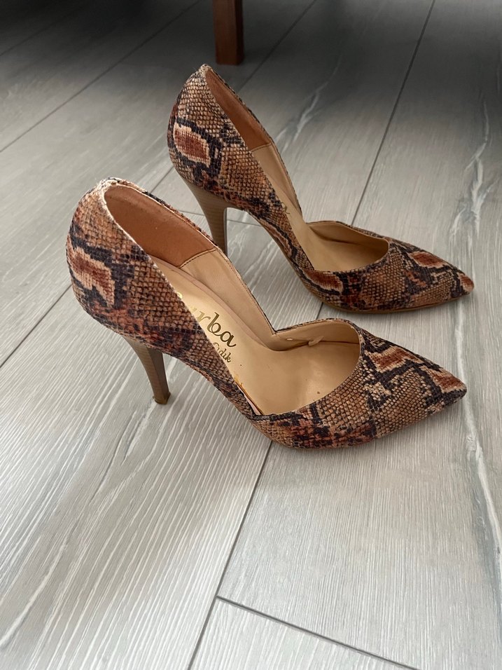 Kahverengi deri yılan desenli stiletto topuklu ayakkabı, tokalı, romantik akşamlar için cesur ve çağdaş tarzda.