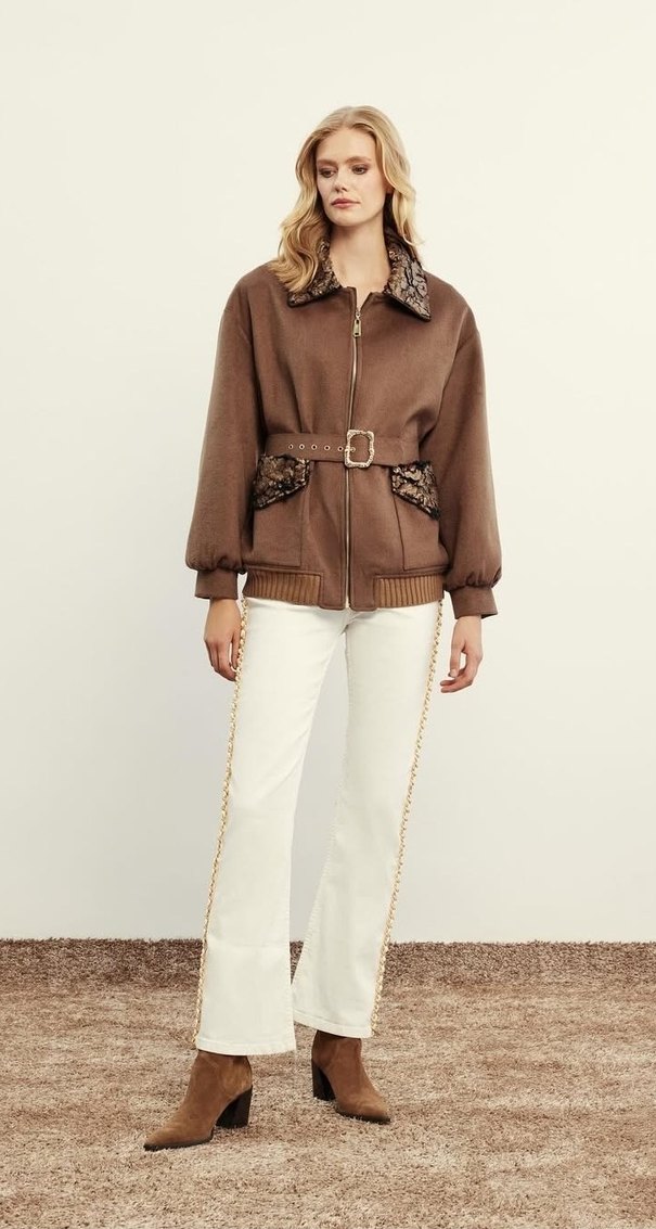 Gevşek kesim kahverengi süet ceket, parlak yılan desenli ve kürk detaylı, yakalı ve uzun kollu, günlük kullanım için uygun.