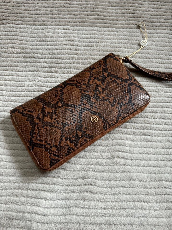 Kahverengi suni deri, yılan desenli, fermuarlı kadın cüzdanı. Klasik ve bohem tarzı bir arada sunar, günlük kullanıma uygundur. Kullanılmadı Elle markadır #cüzdan #elle