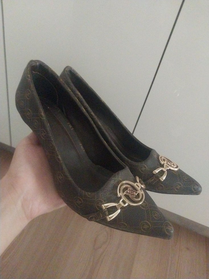 Kahverengi yılan desenli deri stiletto, tokalı ve ofis için uygun şık gotik tarzda.