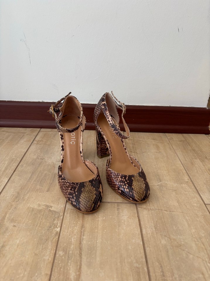 Kahverengi deri, yılan desenli, blok topuklu ve tokalı kadın stilettos ayakkabı, romantik akşamlar için uygun.