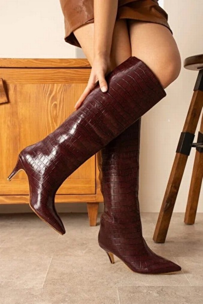 Bordo croco desenli ince Topuklu Kadın Çizme - Görsel 1