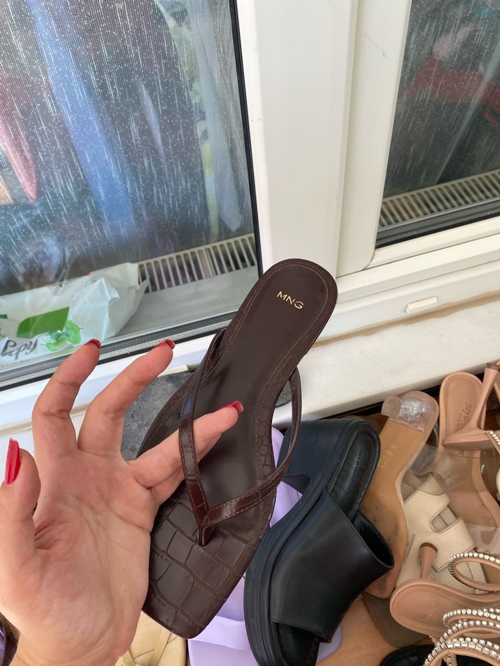 Kahverengi yılan desenli, stiletto topuklu, tokalı ve kauçuk malzemeden yapılmış terlik. Trendy sokak stiline uygun.
